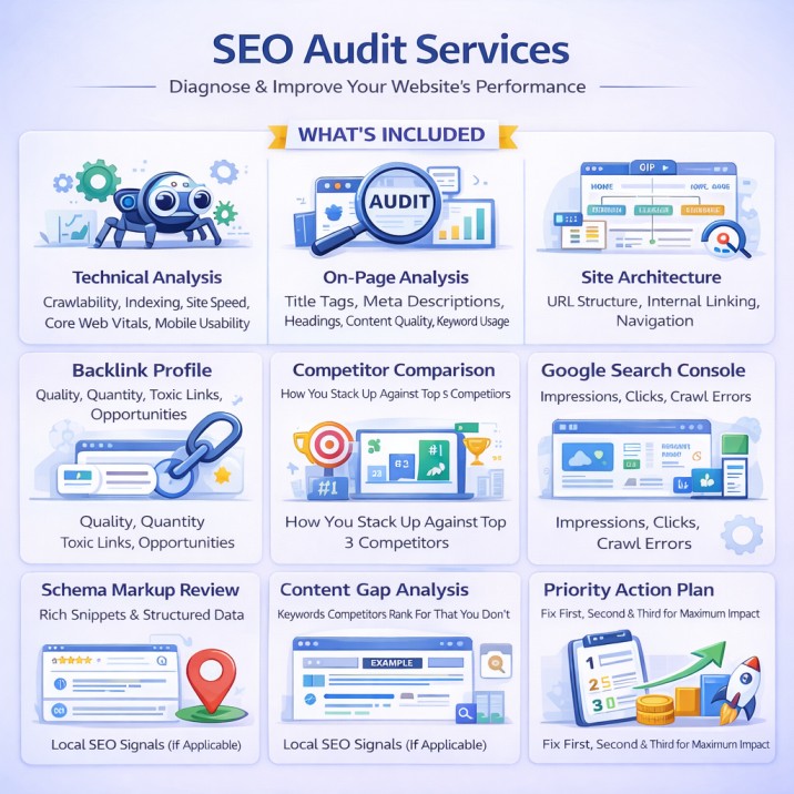 An SEO audit is a comprehensive health check of your website that identifies everything stopping it from ranking higher on Google. Just like a doctor examines a patient before prescribing treatment, an SEO audit examines your website across three areas — technical foundations, on-page content, and off-page authority — and produces a prioritised action plan showing exactly what to fix, in what order, for the fastest improvement in rankings and traffic.